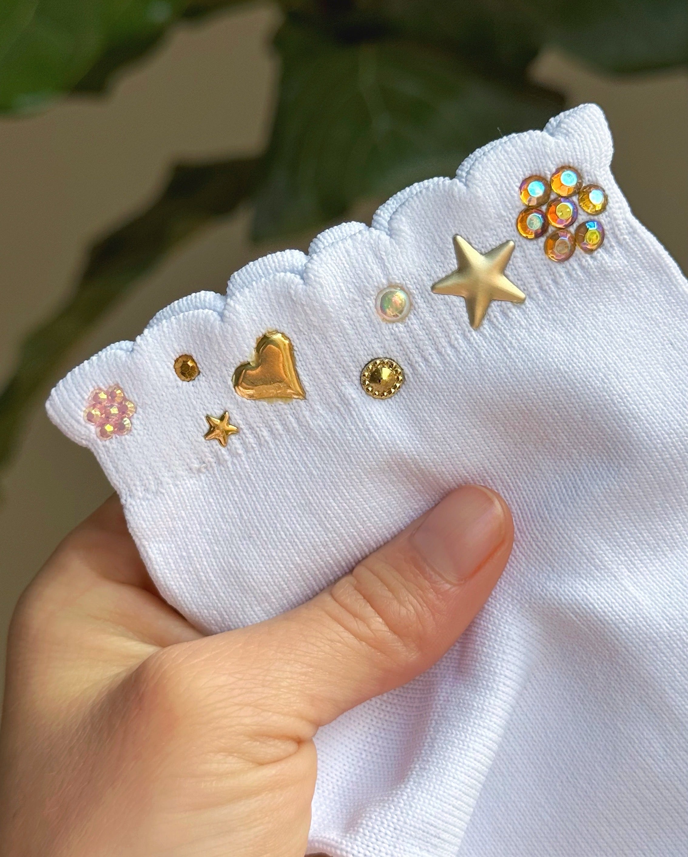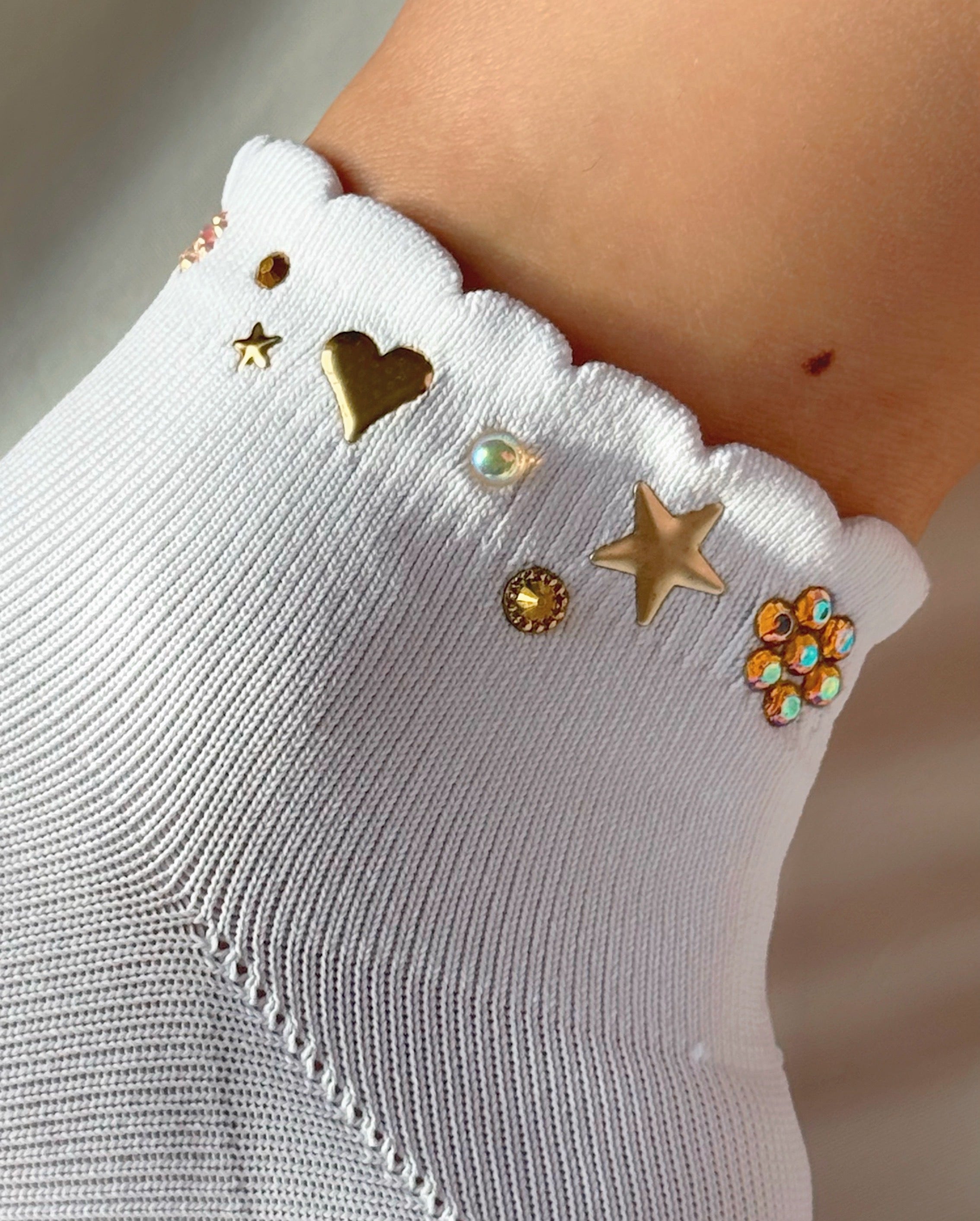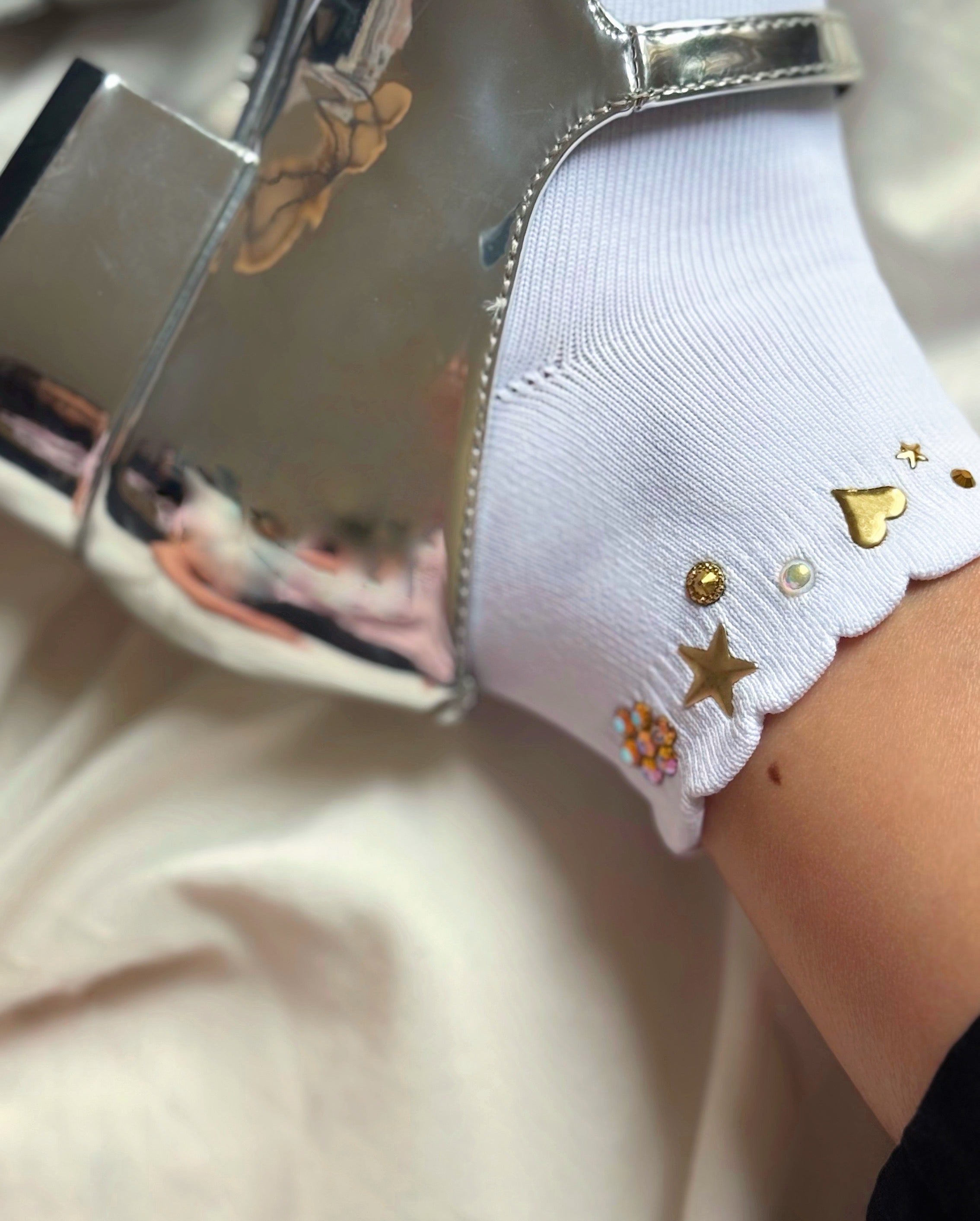 Descripción: Medias blancas en Nylon con apliques de diferentes formas y tamaños alrededor de la media.