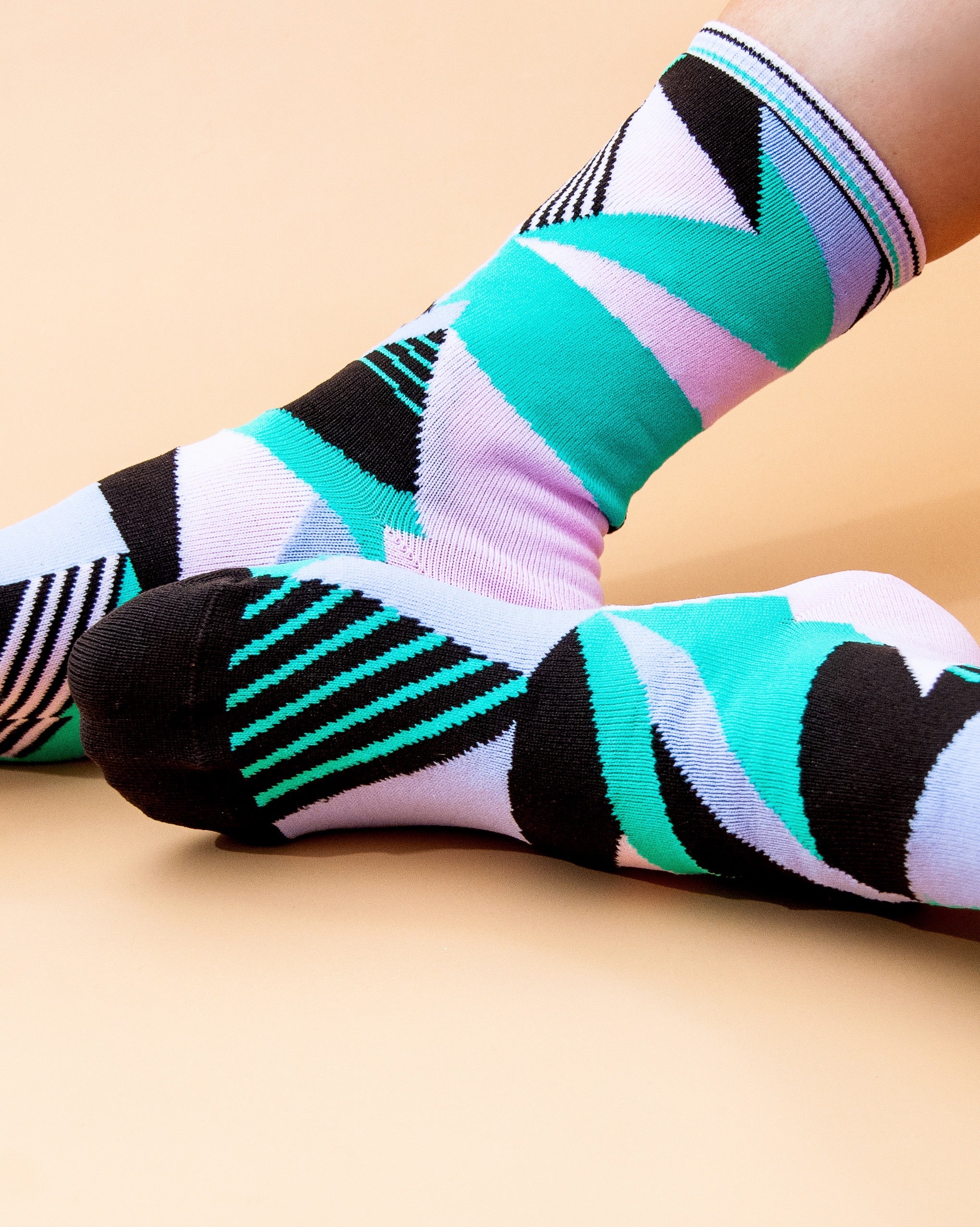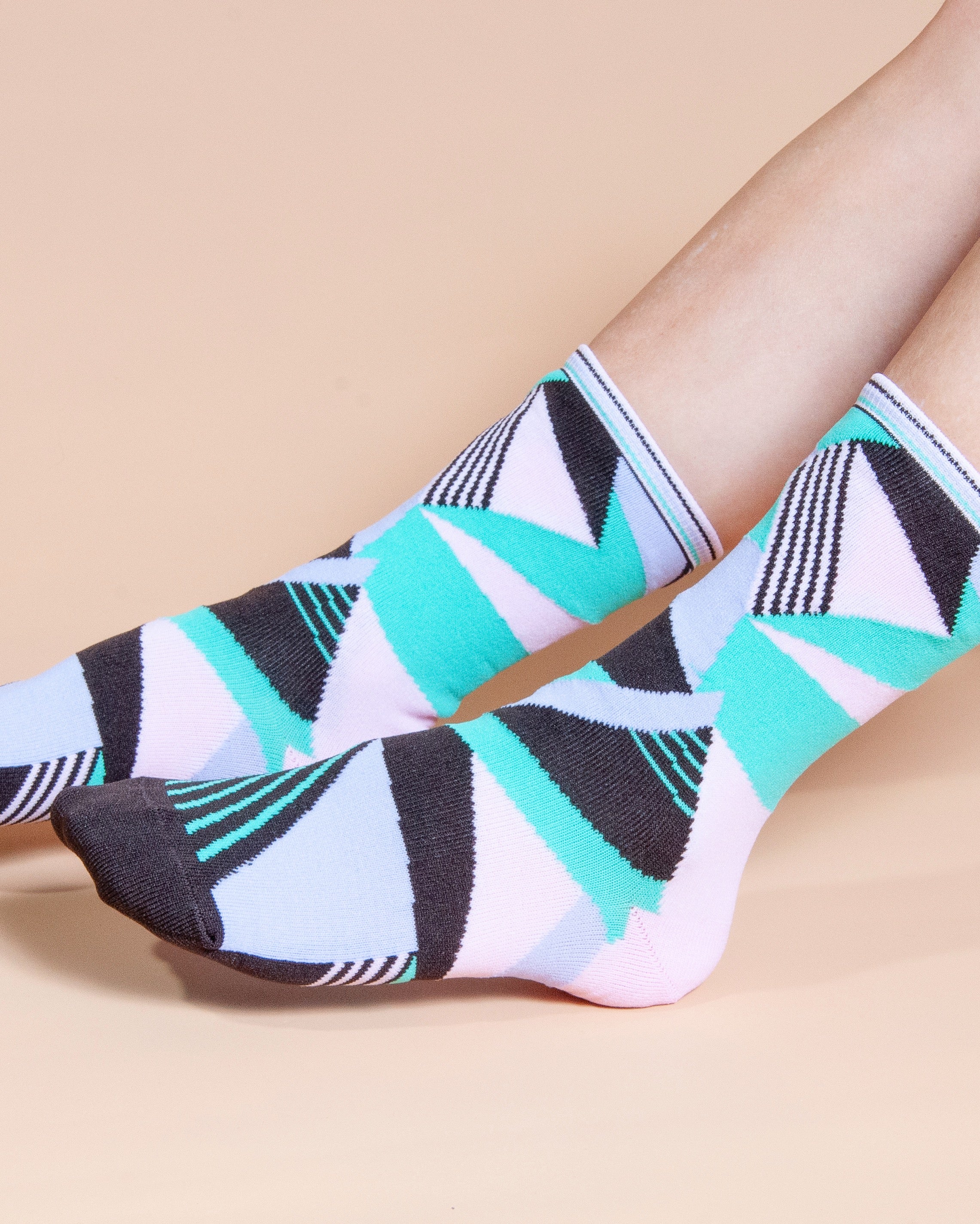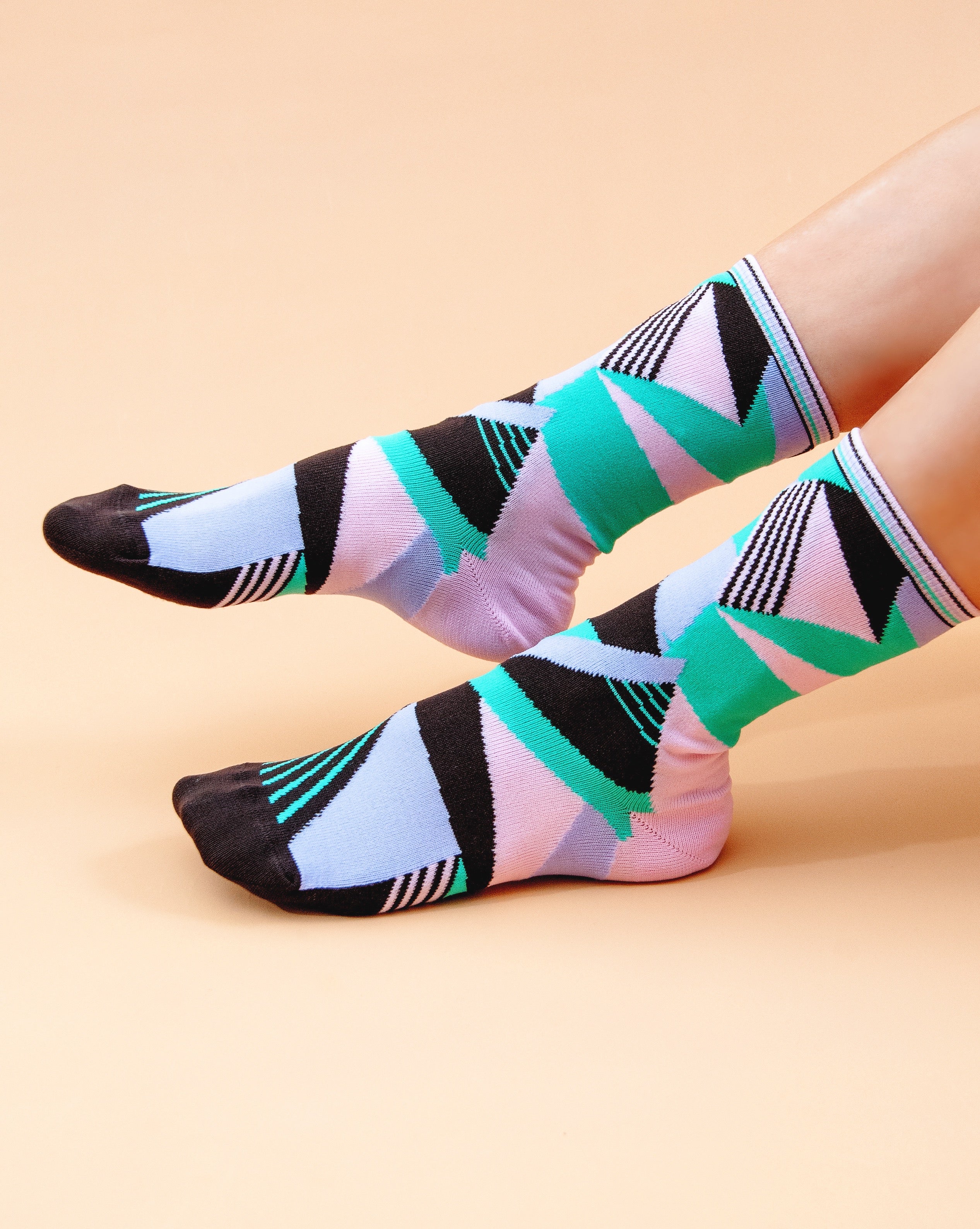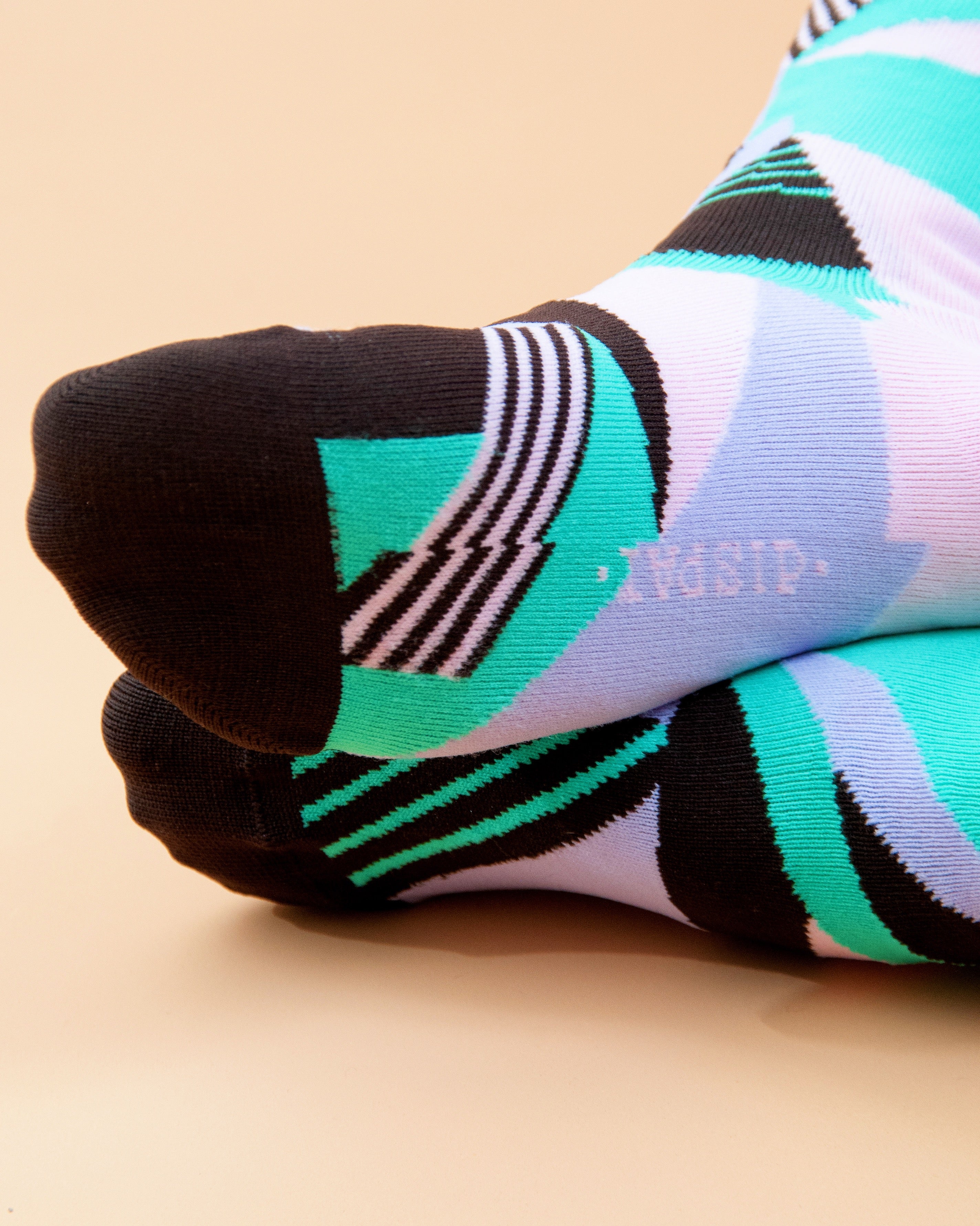 Descripción: Medias en Nylon con diferentes colores y figuras alrededor del diseño.