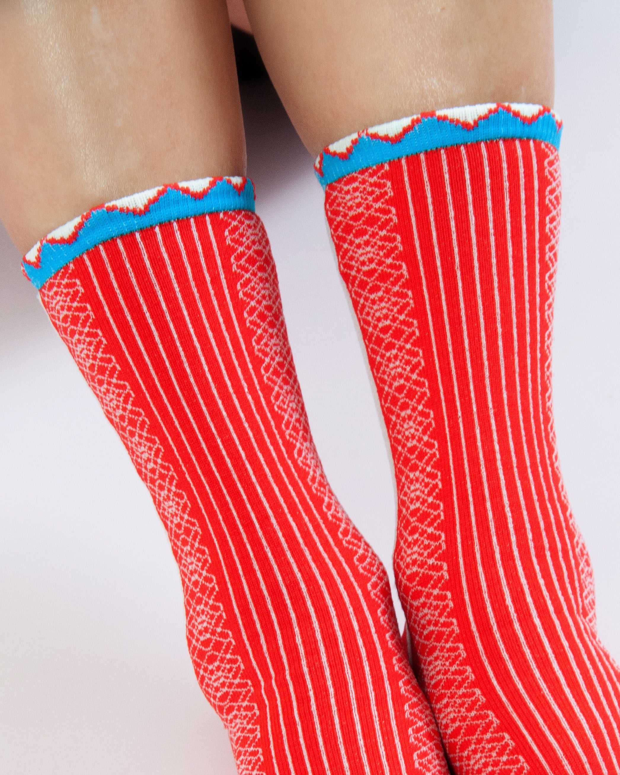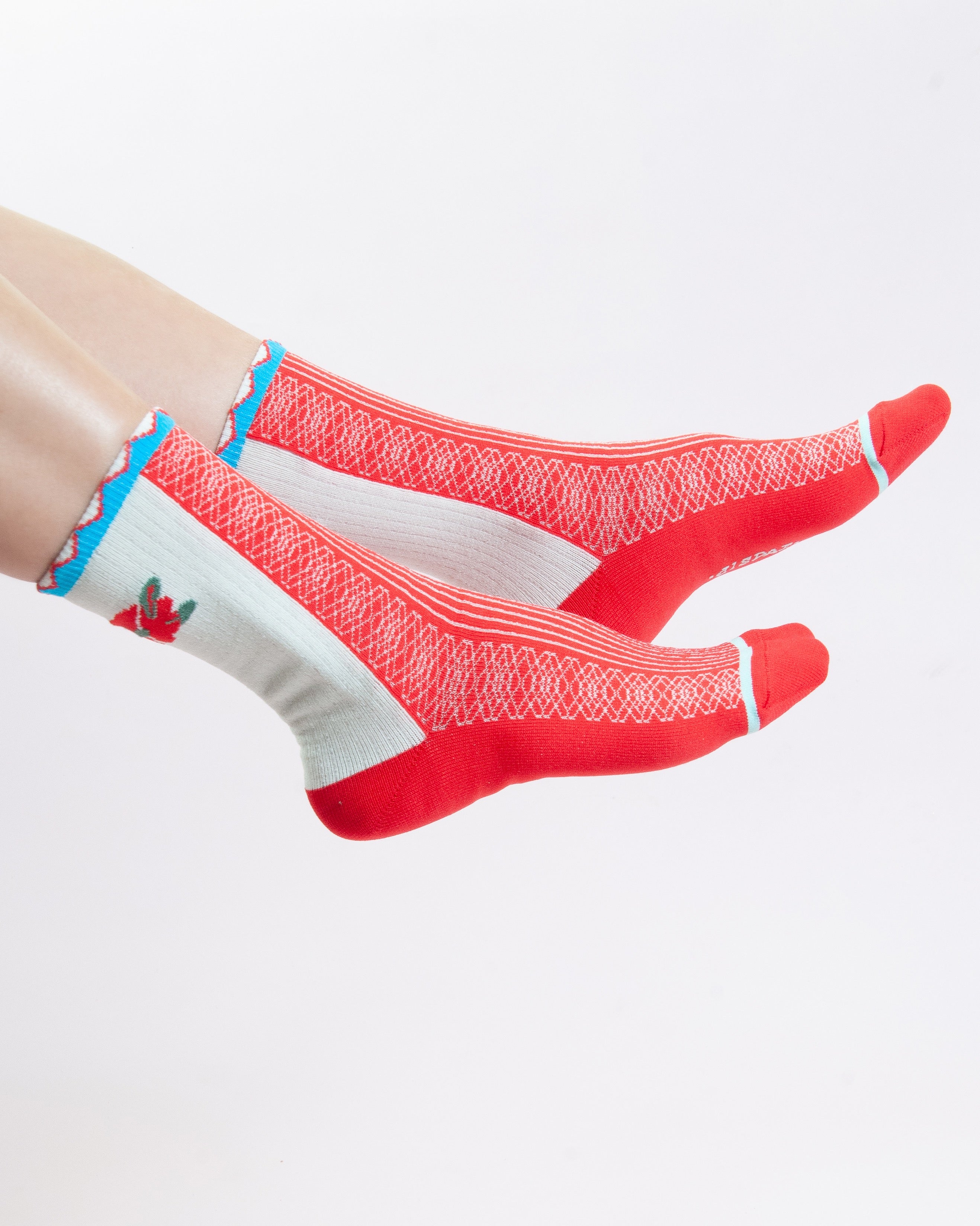 Descripción: Medias en rojas, con franjas blancas, azules y una flor roja en la parte de atrás de la media. Materia del diseño en Nylon