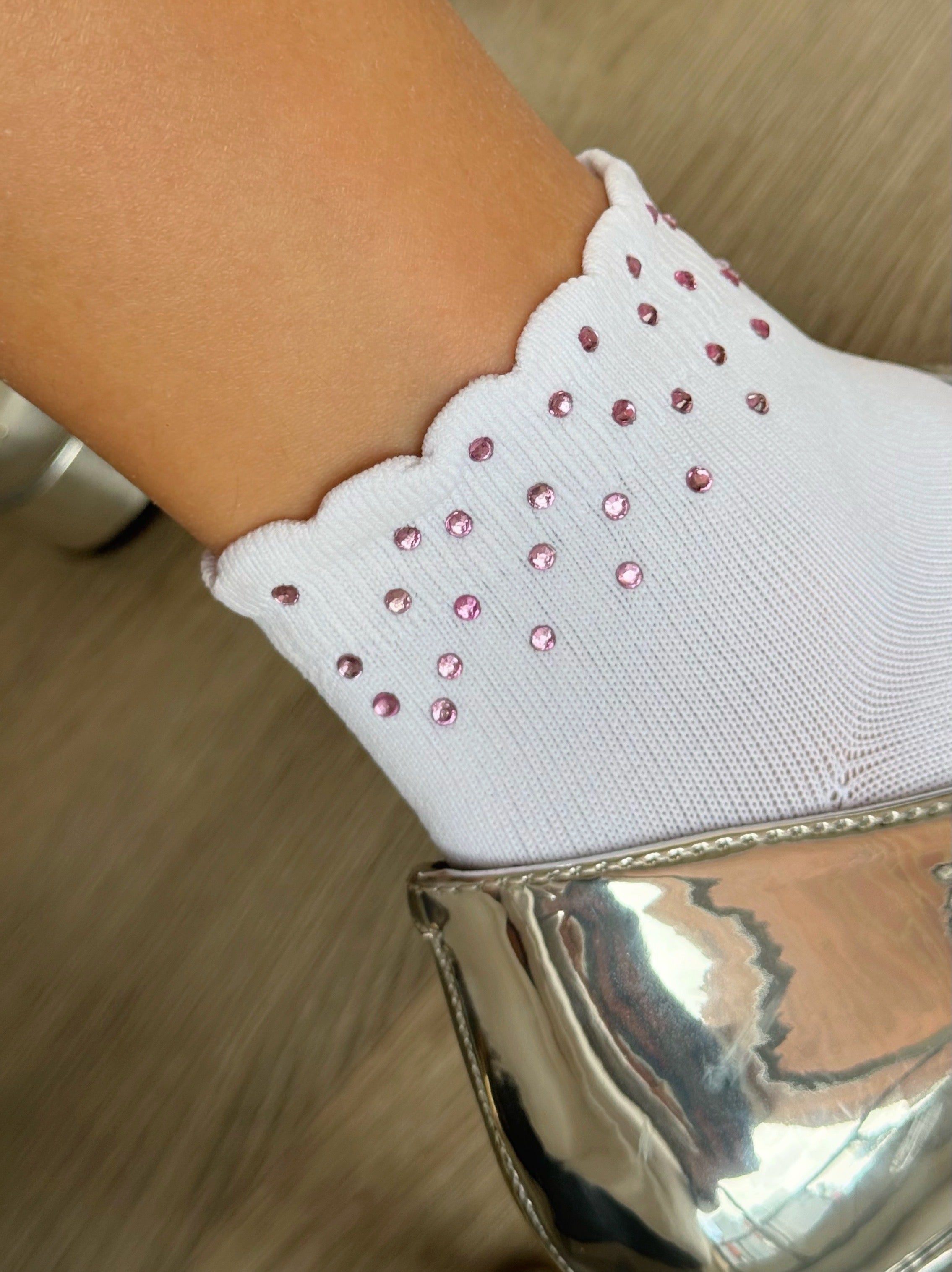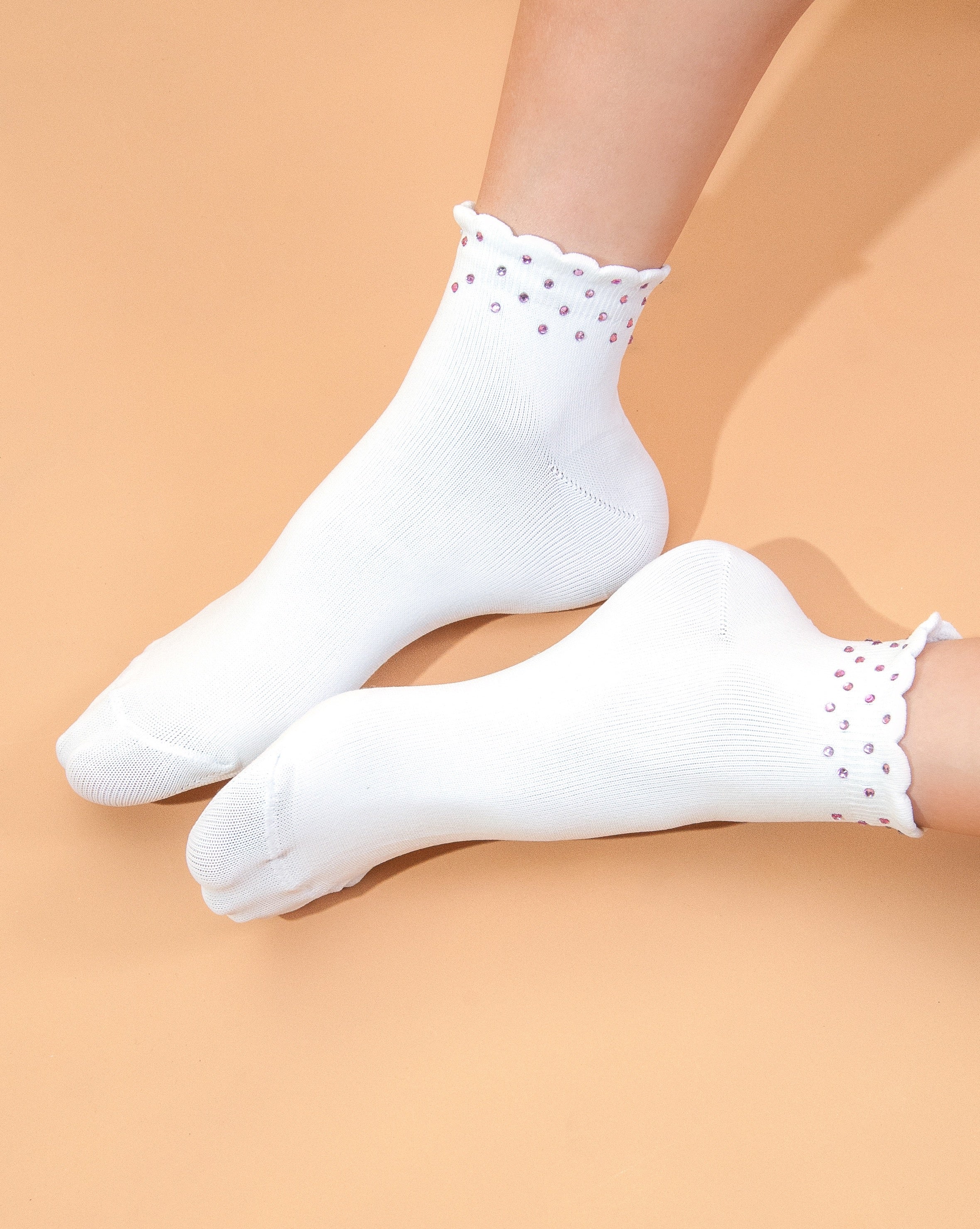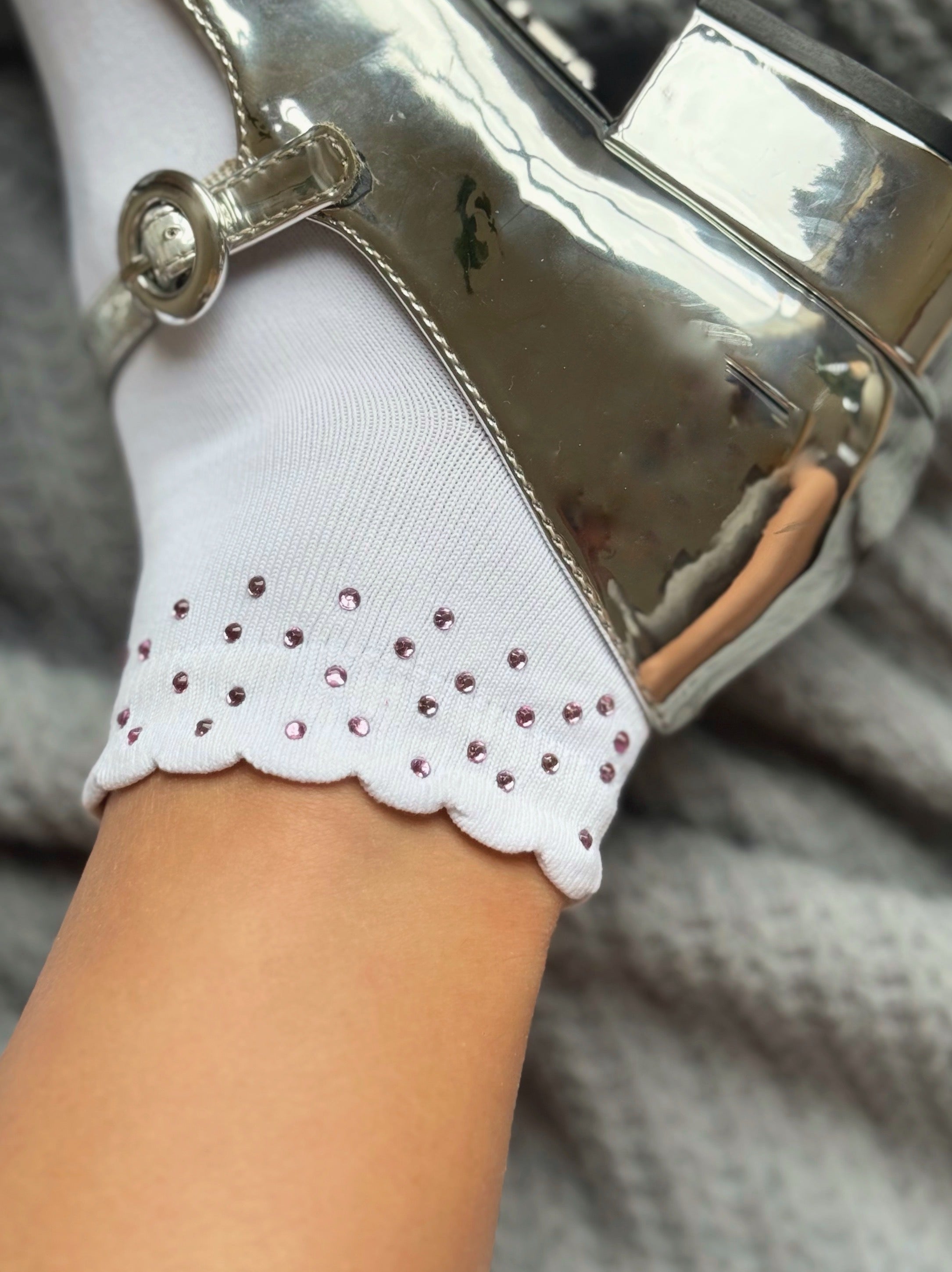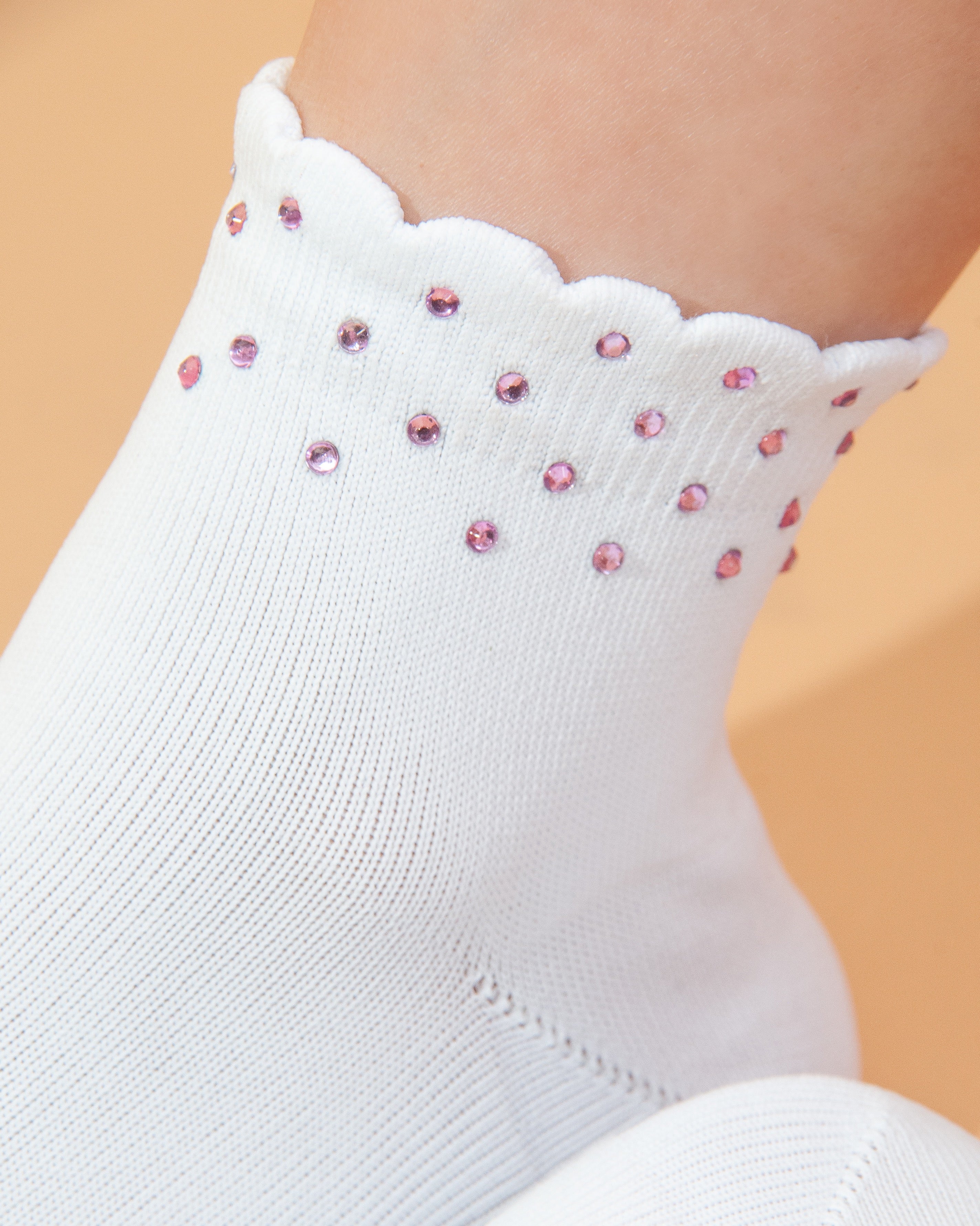 Descripción: Medias blancas en nylon con piedras puestas alrededor de la media
