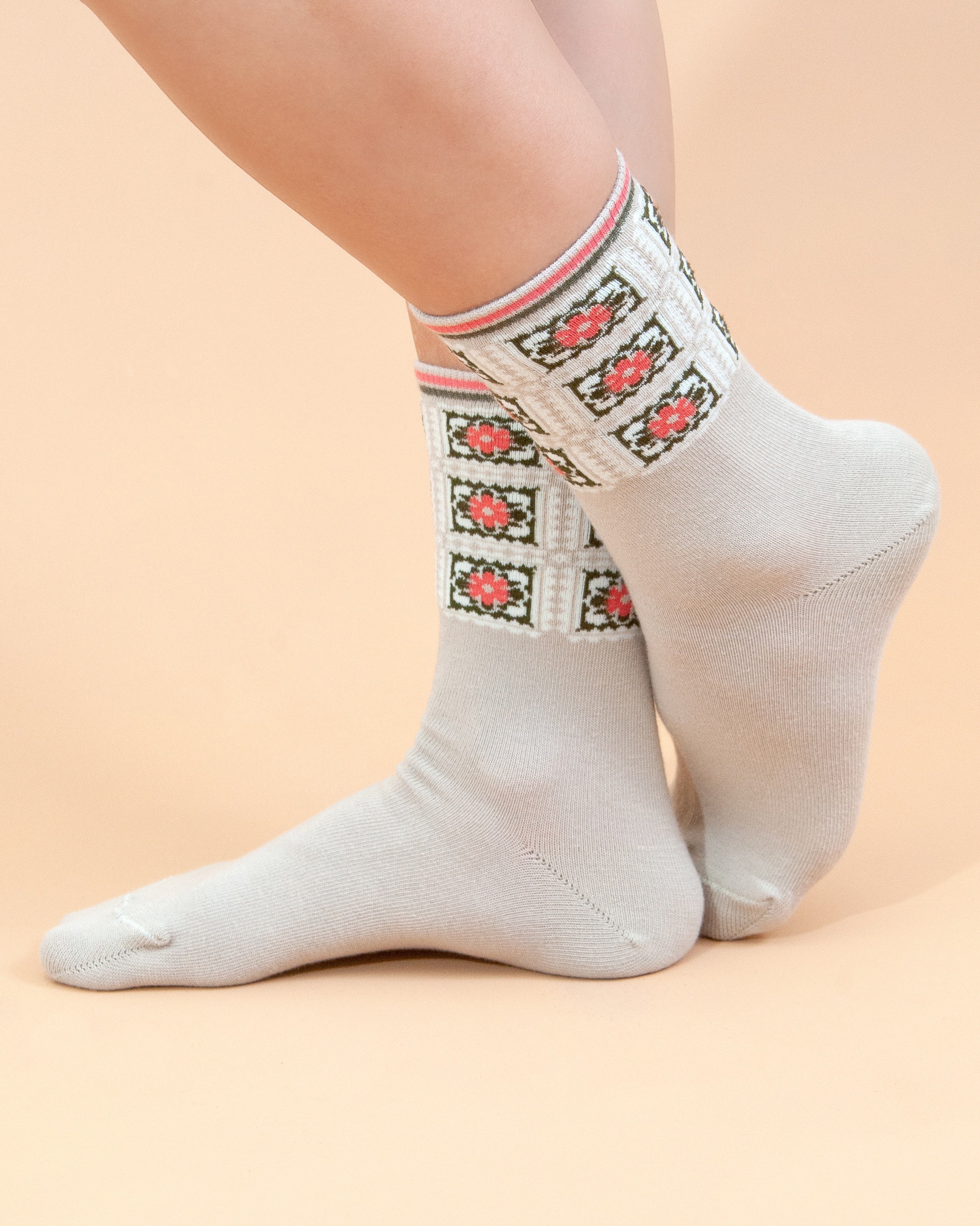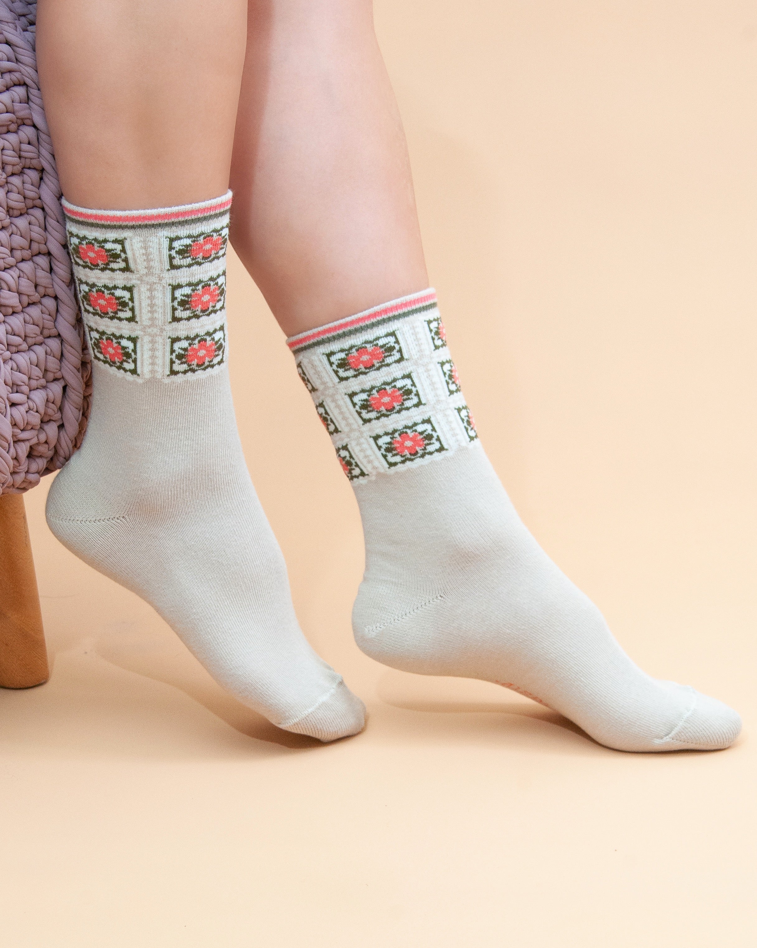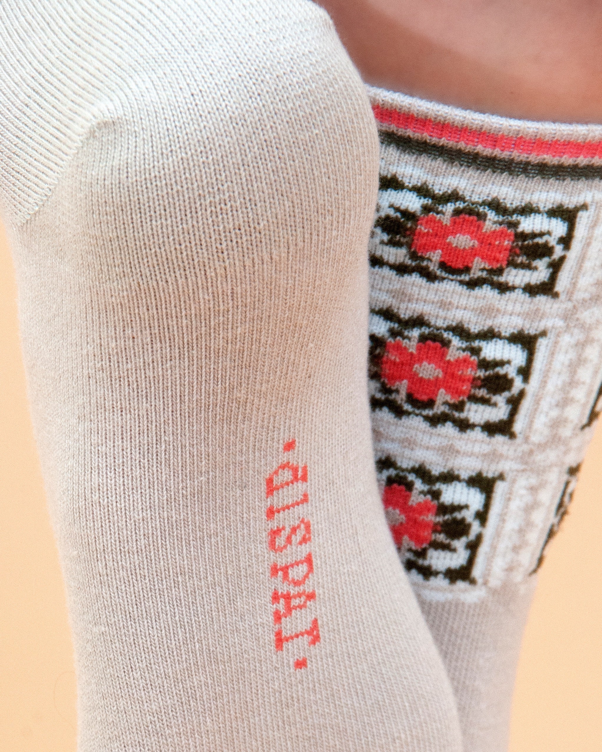 Descripción: Medias color beige pálido con flores alrededor de la media.